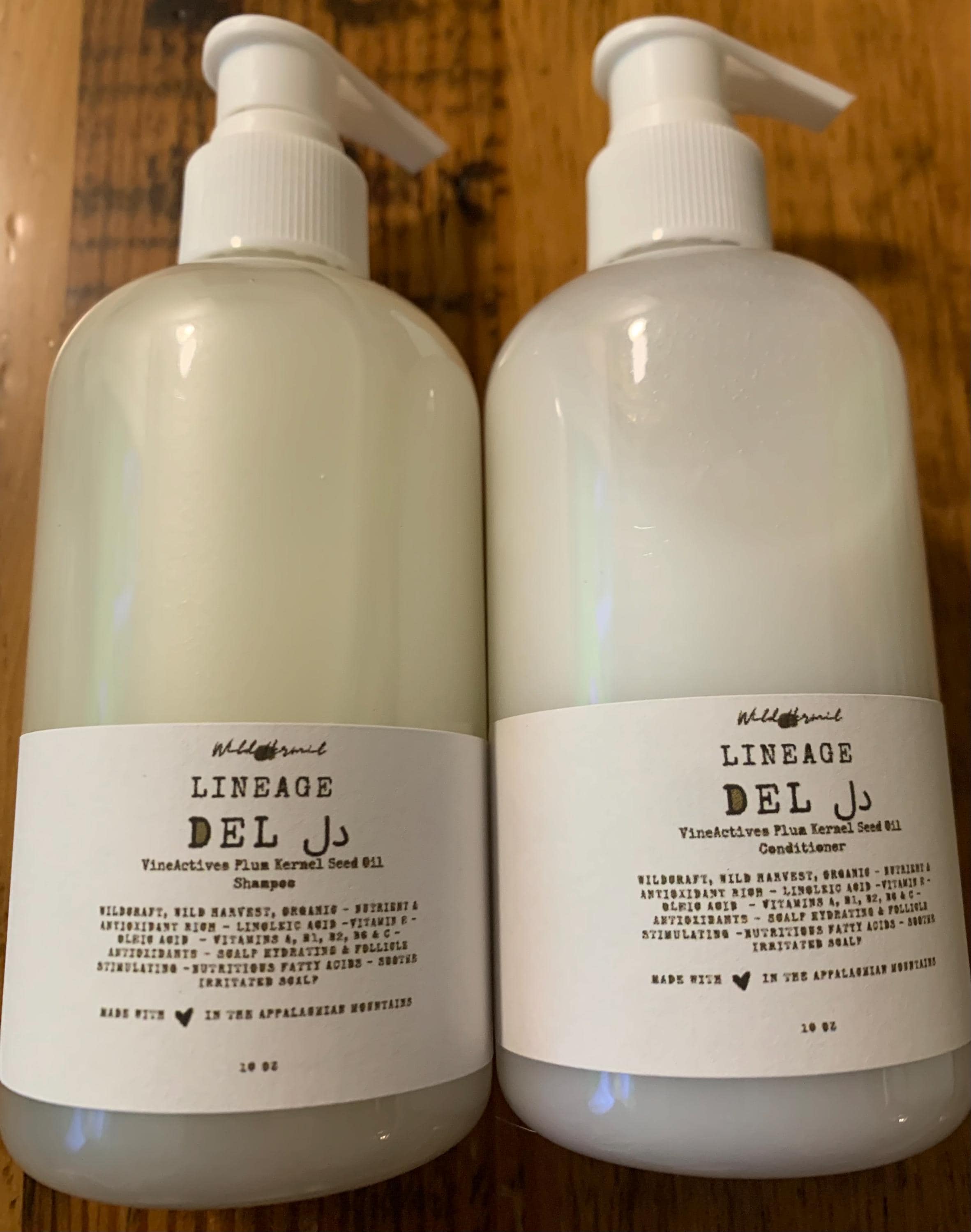 Wild Hermit's Lineage Vineactives Line Organic Shampoo / Conditioner with Goat Milk & Plum Kernel Seed Oil – available in 4 and 10 oz. bottles.
